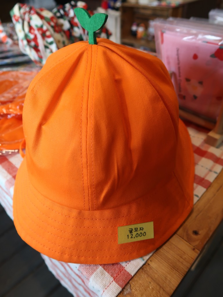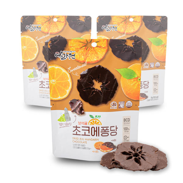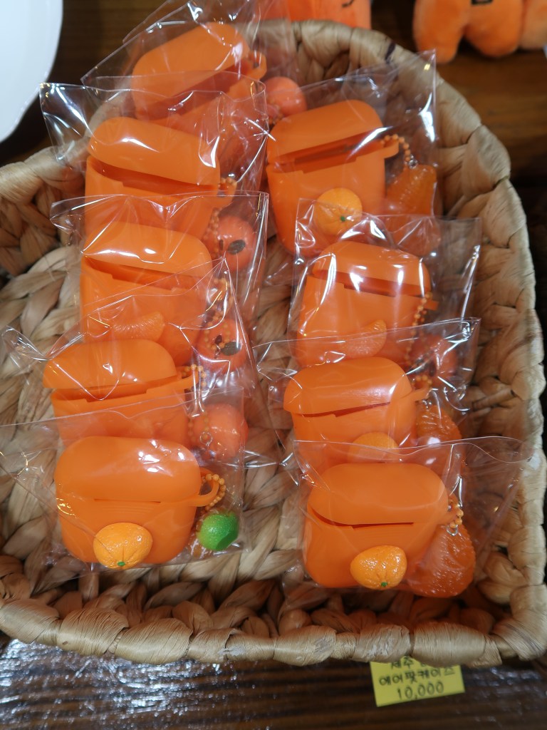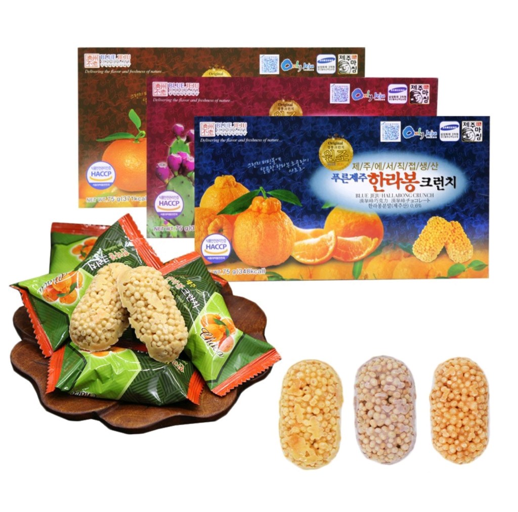 Jeju Island is a well-known destination as the center of citrus production in South Korea. Several processed products from Hallabong oranges 한라봉 and mandarin or tagerine or citrus or kamgyul 감귤 또는 귤 which can be used as souvenirs from Jeju Island such as : Jeju Hallabong chocolate 제주 한라봉 감귤 초콜릿, Jeju Hareubang Chocolate 제주 하르방 감귤 초콜릿, Jeju Orange Tart 제주 감귤 타르트, Jeju Hallabong Crunchy Chocolate 제주 한라봉 크런치, Orange Pai 감귤 파이, Choco Mandarin Jeju Dried 제주 톡 말린 감귤, Jeju udo peanut choco crunch 제주 우도 땅콩 초코 크런치, Orange Fruit cookies 하효 맘 감귤 과 즐 (하효 맘 Hahyomam means Hahyo’s Mom and Heart, a crunchy rice cake snack made by Hahyo’s mothers using their heart or wholeheartedly). Prices vary widely from 10,000 won – 20,000 won (usually for a certain chocolate, 15 boxes of chocolate only 10,000 won).