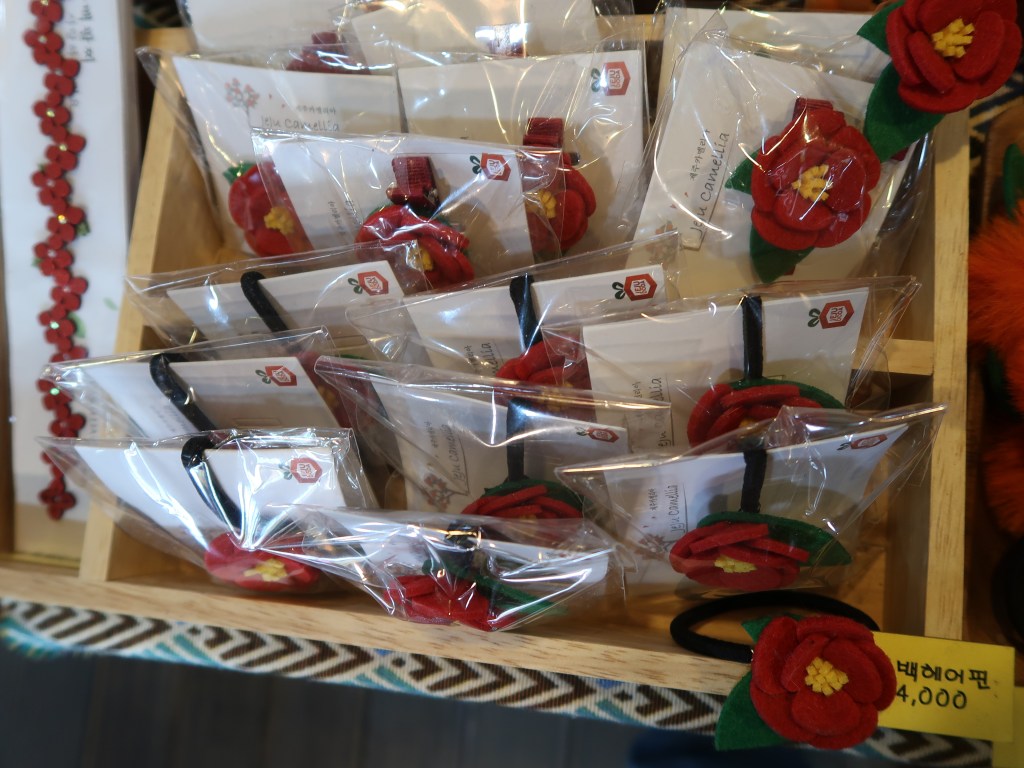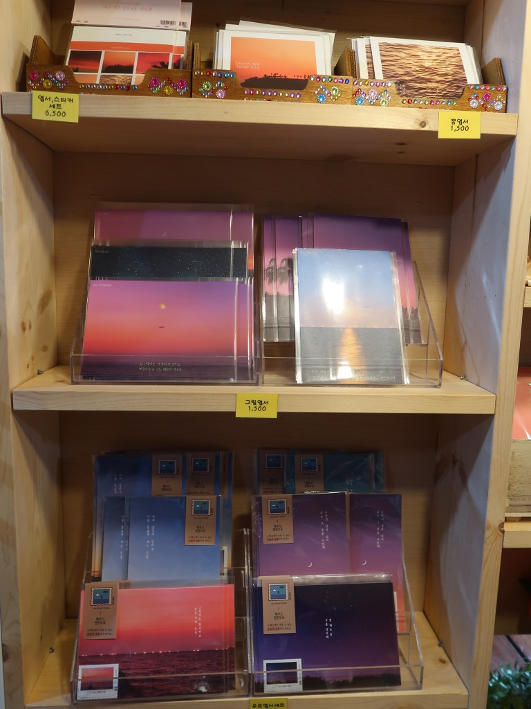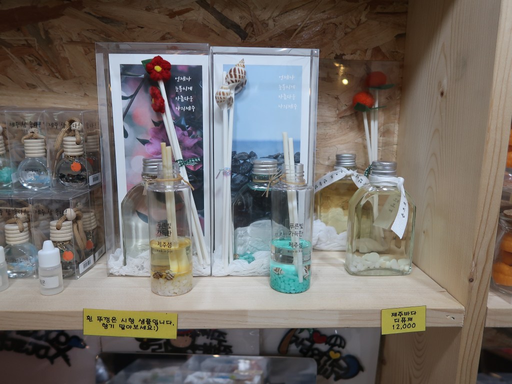 in Jeju Island, you can find functional and beneficial items with the cute and unique jeju touch : Jeju Island postcards, magnets, key rings, keychains, bookmarks, dol hareubang figures, bags, hats, notebooks, glass ball, jewelries, earrigs, hairclips, hand mirrors, candles, pouches, Jeju Hand-cream, earphone case, and many more. and the price varies from 3.000 won – 20.000 won.